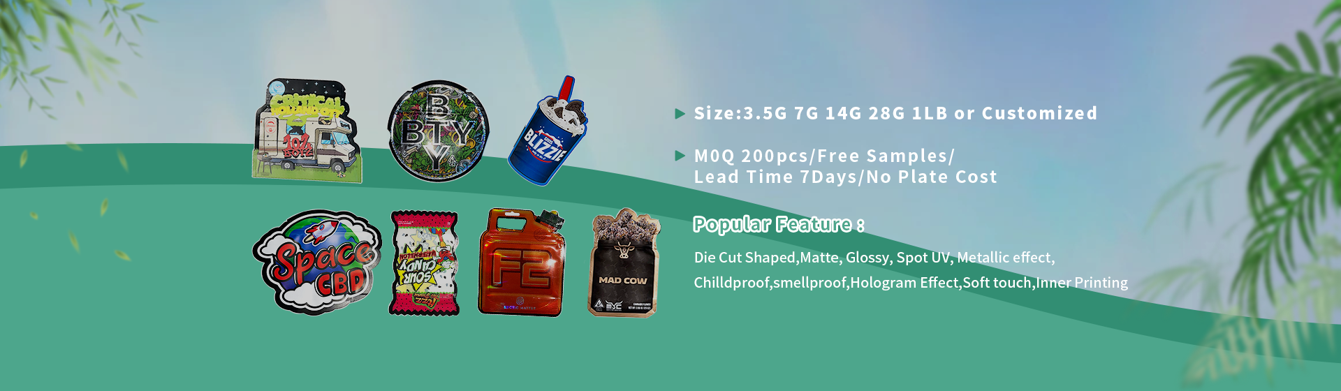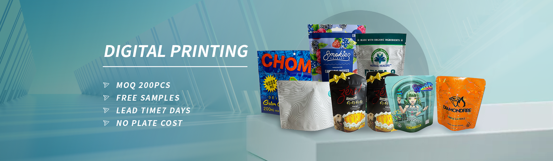 Mainly products including stand up bags, three side seal flat bags, shape bags, flat bottom bags, side gusset bags, spout pouches, paper boxes, paper tubes, shopping bags, stickers, which are widely used in variety fields such as coffee, tea, gummies, pet food, cosmetics, electronics, commodity, pharmaceutocal, agriculture, toys etc.
